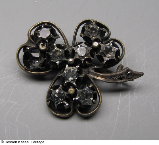 Alpaca-Brosche in Form eines dreiblättriges Kleeblattes mit Glassteinen (Trauerschmuck) |