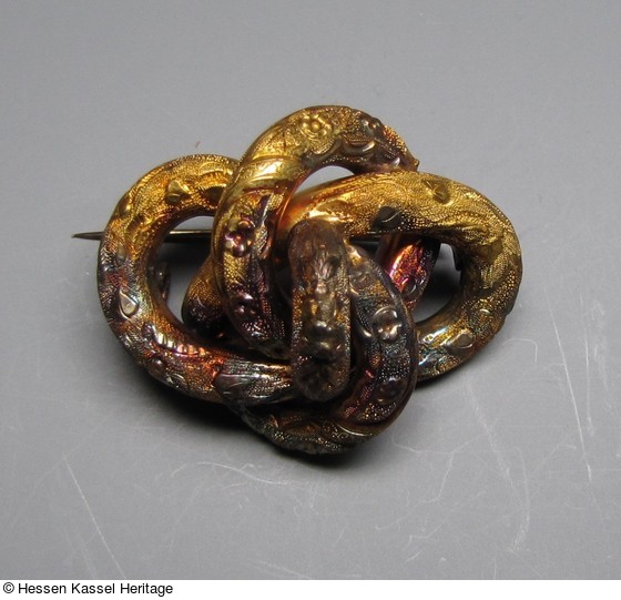 oldblech auf Bronze platiert, gedrückt, punziert, graviert und montiert. Aus 5 Teilen gefertigt, die wiederum aus je 2 Teilen verlötet wurden. |