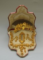 Collier 44,8 x 2,3 cm (Objektmaß) Brosche 6,1 x 4 cm (Objektmaß) Ohrgehänge 7 x 2,6 cm (Objektmaß) Gürtelschließe 9,5 x 4 cm (Objektmaß) Haarnadel 19,8 cm (Länge) Etui 24,8 x 22,6 x 12,1 cm (Objektmaß)