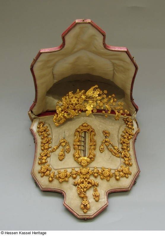 Bronzevergoldete Schmuckgarnitur mit Dekor aus Blüten und Früchten: Halskette, Vorsteckbrosche, Ohrringe, Kamm, Ansteckblume, Gürtelschnalle |