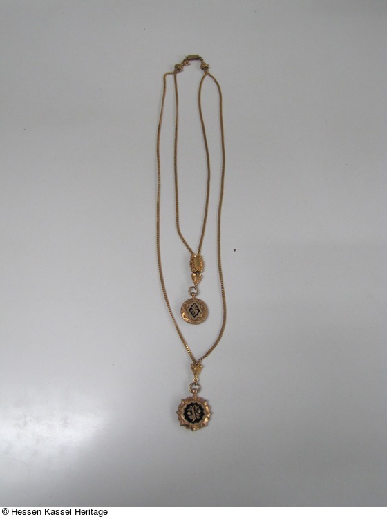 Silbervergoldete doppelte Halskette mit zwei Medaillons in Blütenform bzw. mit Blumensträußchen in schwarzem Email verziert