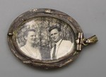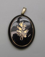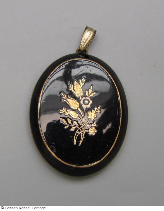 Silbervergoldeter ovaler Medaillon-Anhänger mit Blumenstrauß auf schwarzem Email (Trauerschmuck) |