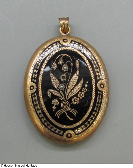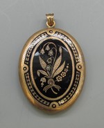Silber graviert, vergoldet, Rückseite guillochiert. Schwarzes Email, 3 Perlen (1 fehlt). |