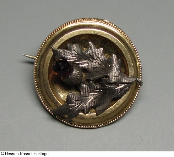 Goldblech gedrückt, Eichenblätter Silber getrieben, graviert und genietet, die Eichel gegossen, hellvioletter Glasstein. |
