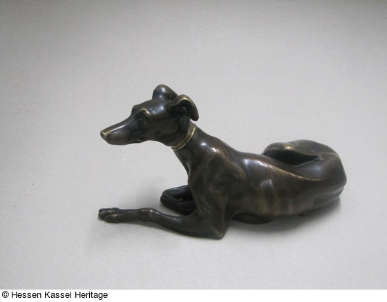 Zweiteiliger Messingguß, bronzefarbene Patinierung, vergoldetes Halsband. |