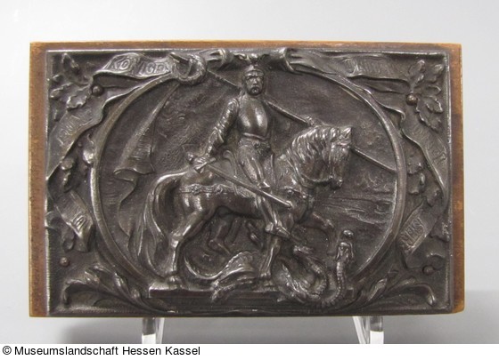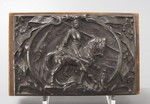 Gußeisen, dunkel-bronzeartig patiniert. Mit 4 Stiften auf einem 2,5 cm dicken Buchenholzblock befestigt. |
