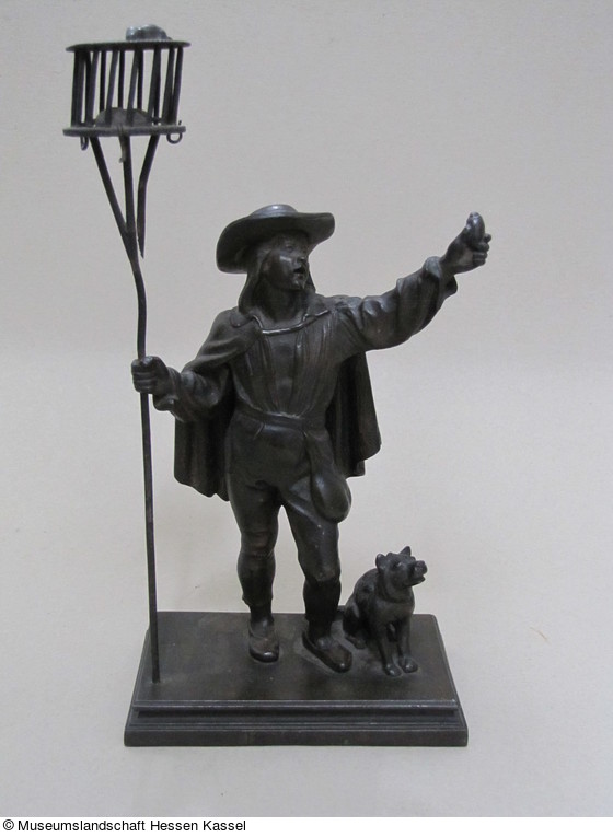 Mehrteiliger Eisenguß; Figur 4-teilig, Hund 3-teilig; Sockel angeschraubt. |