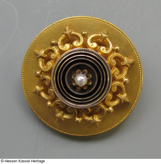 Runde vergoldete Brosche mit schwarzem Email und Perle