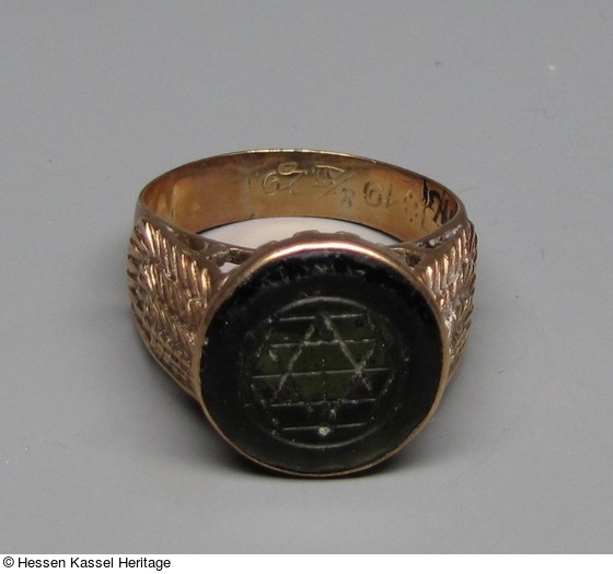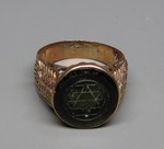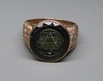 Goldener Freimaurerring mit ägyptischem Sonnensymbol und gotischem Maßwerk |