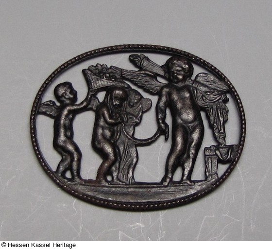 Durchbrochene ovale Eisenplakette mit der mystischen Hochzeit von Amor und Psyche |