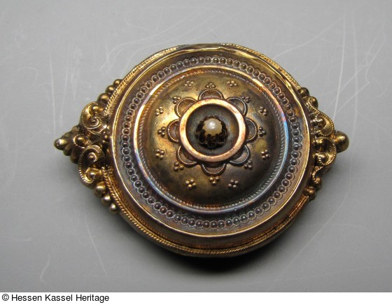 Vorderseite Goldblech, Montierung Silber, vergoldet, gestanzt. Halbperle in Krappenfassung. Glas. |