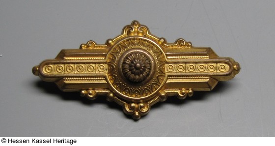 Vergoldete Brosche mit rundem Mittelteil und waagrechten Flügeln |