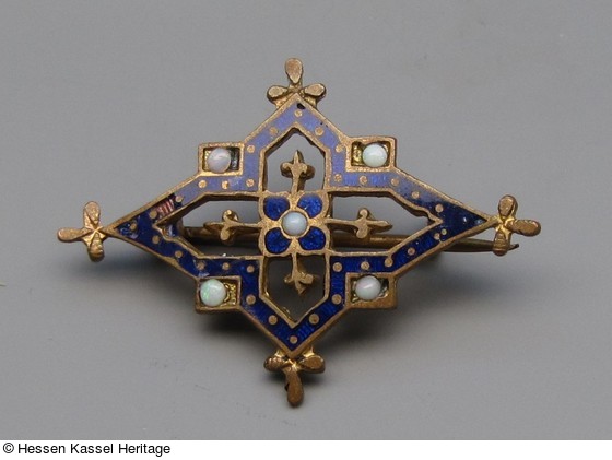 Kleine rautenförmige Brosche in gotisierenden Formen