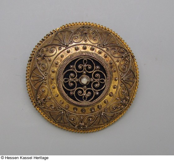 Silber, gedrückt, vergoldet. Cordierter Kupferdraht, mit Silber verlötet, (falsche) Granulation. Blaues Glas, Perlmutter. |