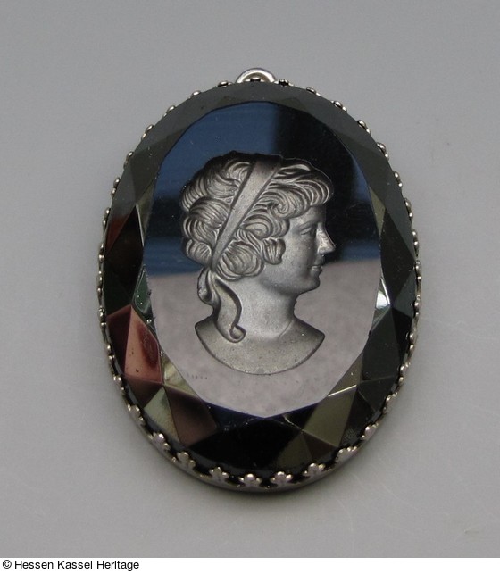 Kastenfassung: Messing, vernickelt, gestanzt. Gemme: Schwarzes Preßglas, auf dem facettierten schrägen Rand und dem Kopf der Gemme Platin aufgedampft. |