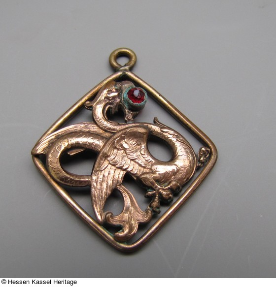 Kupferlegierung vergoldet, nachpunziert. Der rahmende Draht ist angenietet. Glasstein. |