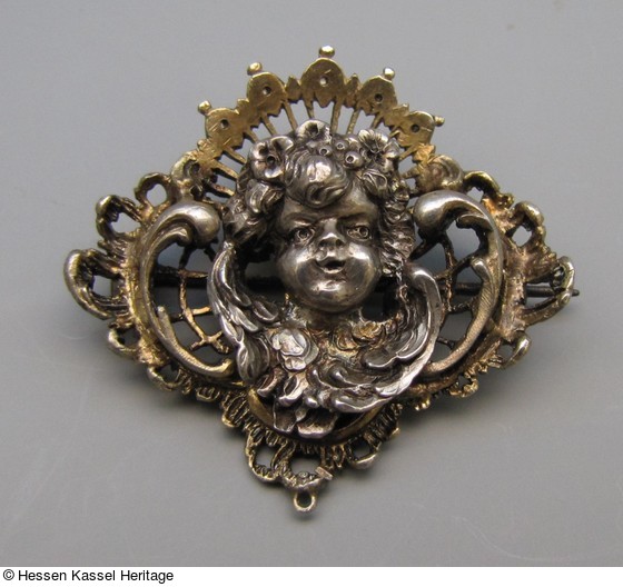Silberne Brosche mit Amorkopf in Rocaillen |