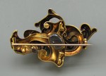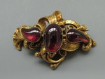 Goldene Medaillon-Brosche aus verschlungenen Bändern, mit drei Granatcabochons bessetzt |