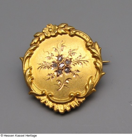 Runde goldene Brosche mit Blütenzweig in Rokokorahmen |