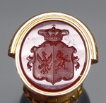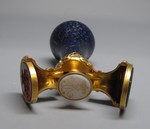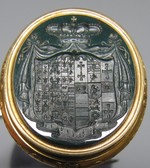 Gold gegossen, geschnitten, graviert, mattgebeizt; Tremulierstich; Lapislazuli; der Metallfuss ist aufklappbar und enthält 3 Wappensiegel in Blutjaspis, Carneol und Chalcedon geschnitten. Das Etui hat einen doppelten Boden: Unter dem Samteinsatz sind Abdrücke der 3 Wappen in rotem Lack. |