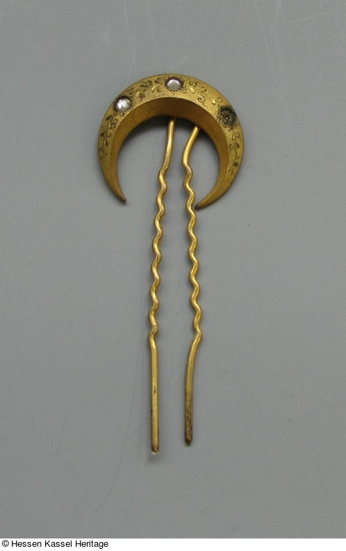 Silber gegossen, punziert, graviert, tremoliert, vergoldet, 3 Bergkristalle (1 fehlt).