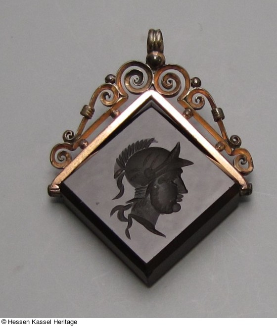 Silbervergoldeter Anhänger mit Karneolgemme, die einen Kriegerkopf zeigt |