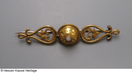 Silber, getrieben und punziert, vergoldet. Cordierter Draht. Milchglasstein (Ergänzung). |