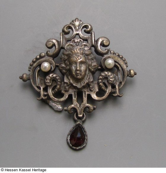Silberne, durchbrochene Brosche im Renaissance-Stil mit Perlen und Granat