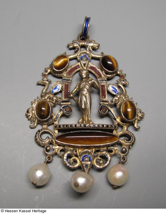 Silbervergoldeter, durchbrochener Anhänger mit stehender Diana, umgeben von Rollwerk mit Email, Tigeraugen, Katzenauge und Perlen