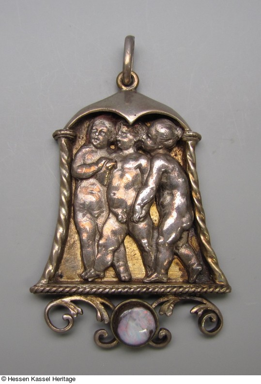 Silber, gegossen. Hintergrund des Reliefs vergoldet. Cordierter Draht. Opal. |