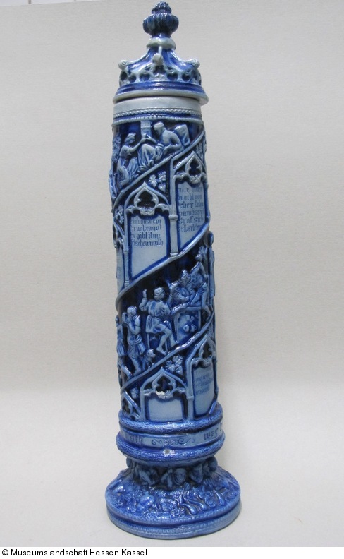 Die Rückbesinnung der um 1800 entstandenen Romantik auf das Mittelalter, in deren Folge auch Renaissance und Barock eine neue Wertschätzung erfuhren, führte im Kunstgewerbe bis etwa zum Ende des Jahrhunderts zur Popularität historisierender Formen. – Die figürlichen Reliefs des hohen Deckelpokals zitieren Darstellungen auf rheinischem Steinzeug des 16. und 17. Jahrhunderts in der dafür typischen blau-grauen Glasur. Entworfen wurde er vermutlich 1840 von Ludwig Foltz.