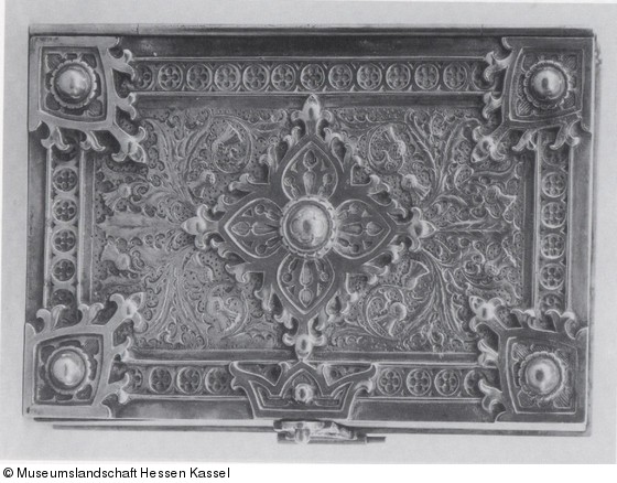 Die Rückbesinnung der um 1800 entstandenen Romantik auf das Mittelalter, in deren Folge auch Renaissance und Barock eine neue Wertschätzung erfuhren, führte im Kunstgewerbe bis etwa zum Ende des Jahrhunderts zur Popularität historisierender Formen. – Der kräftig profilierte Buchdeckel zeigt gotisierende Ornamente. Die Seitenwände imitieren mit horizontalen Linien den Buchschnitt. In dem mit rotem Samt ausgekleideten Inneren wurde vermutlich ein Buch verwahrt. Das mehrfach verwendete Distelornament, das Emblem Nancys, bezeugt die Bestimmung der Kassette für Lothringen.