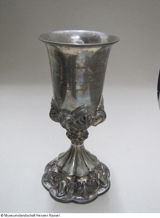 Die Rückbesinnung der um 1800 entstandenen Romantik auf das Mittelalter, in deren Folge auch Renaissance und Barock eine neue Wertschätzung erfuhren, führte im Kunstgewerbe bis etwa zum Ende des Jahrhunderts zur Popularität historisierender Formen. – Der mit Spitzbögen und Blattwerk geschmückte Fuß gibt dem Pokal trotz der schlicht gestalteten Kuppa ein insgesamt gotisches Aussehen. Die Wandung trägt die gravierte Inschrift: „Herrn Conrad Wagner / in Anerkennung 50jähriger treuer / Dienstführung am 1. Juni 1876 / Die Residenzstadt Cassel“ und auf der Gegenseite das Kasseler Stadtwappen.