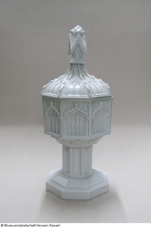 Die Rückbesinnung der um 1800 entstandenen Romantik auf das Mittelalter, in deren Folge auch Renaissance und Barock eine neue Wertschätzung erfuhren, führte im Kunstgewerbe bis etwa zum Ende des Jahrhunderts zur Popularität his-torisierender Formen. – Form und Dekor des für Haustaufen gedachten kleinen Taufsteins zitieren Elemente spätgotischer englischer Architektur, die durch geschweifte „Eselsrücken“ sowie die breiten Tudorbogen charakterisiert sind (Perpendicula-Style).