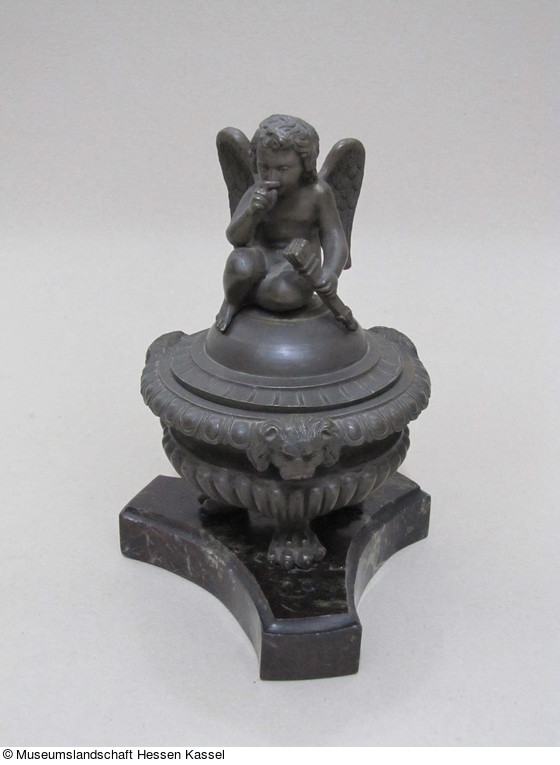 Der Familienüberlieferung der Schenkerin zufolge handelt es sich um eine Arbeit Werner Henschels, der besonders in dem Jahrzehnt nach 1810 zahlreiche Gebrauchsgeräte entworfen hat. Zeit seines Lebens schuf der Bildhauer knieende Engel, die meist für Grabmäler bestimmt waren. Der kauernde Amorknabe steht dem Bronzeengel auf dem Grabmal der Maria E. Grimm (+ 1842, Kassel, Altstädter Friedhof) nahe.