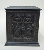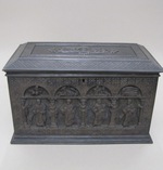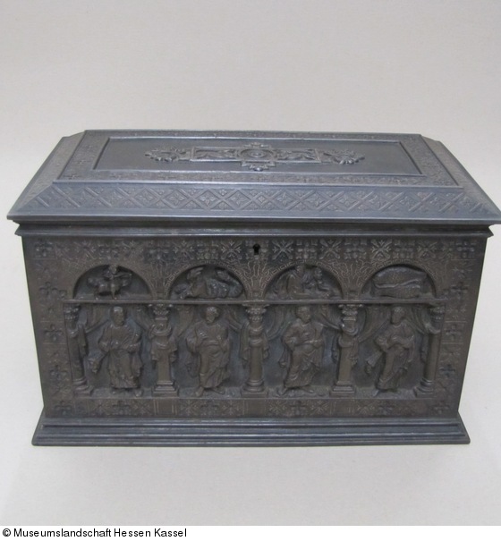 Die Rückbesinnung der um 1800 entstandenen Romantik auf das Mittelalter, in deren Folge auch Renaissance und Barock eine neue Wertschätzung erfuhren, führte im Kunstgewerbe bis etwa zum Ende des Jahrhunderts zur Popularität historisierender Formen. – Die Eisenkassette ist einem spätkarolingischen Elfenbeinreliquiar nachgebildet, von dessen reliefierten Wandungen sich Fragmente erhalten haben. Das Original frei in Eisenguß umzusetzen, entspricht kunstgewerblichem Historismus.