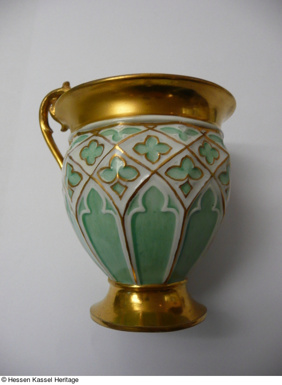 Porzellan, formgefertigt, weiß glasiert. Bemalung der Tasse: Grund des Reliefdekors meergrün, Fuß, Henkel und Lippe vergoldet, Dekor mit dünnen goldenen Linien gehöht. Untertasse: Im Fond grünes Band, Grund der Vierpässe und der Dreipässe darüber ebenfalls meergrün, Goldränder und -höhungen. |