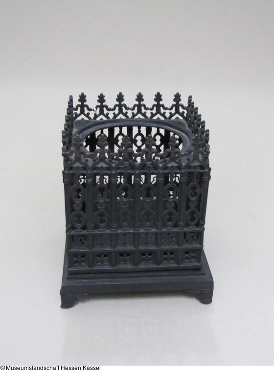 Die Rückbesinnung der um 1800 entstandenen Romantik auf das Mittelalter, in deren Folge auch Renaissance und Barock eine neue Wertschätzung erfuhren, führte im Kunstgewerbe bis etwa zum Ende des Jahrhunderts zur Popularität historisierender Formen. - Das Lampenhäuschen zeugt von hoher technischer Fertigkeit und erinnert im architektonischen Aufbau an gotische Bronzerauchfässer. Im Gleiwitzer Katalog von 1847 sind weitere angeboten, was auf die Beliebtheit dieser gotisierenden Beleuchtungskörper hinweist.