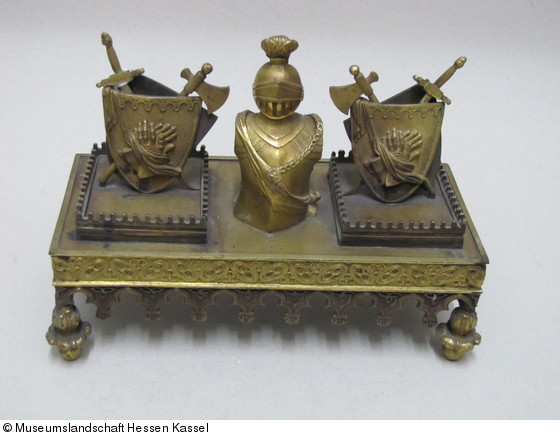 Die Rückbesinnung der um 1800 entstandenen Romantik auf das Mittelalter, in deren Folge auch Renaissance und Barock eine neue Wertschätzung erfuhren, führte im Kunstgewerbe bis etwa zum Ende des Jahrhunderts zur Popularität historisierender Formen. – Das im französischen Style à la Cathedrale verzierte Schreibzeug aus Brustharnisch und flankierenden Trophäen, inspiriert von der Ritterromantik, dient zur Aufnahme von Schreibfedern, Tintenfaß und Streusandbüchse.