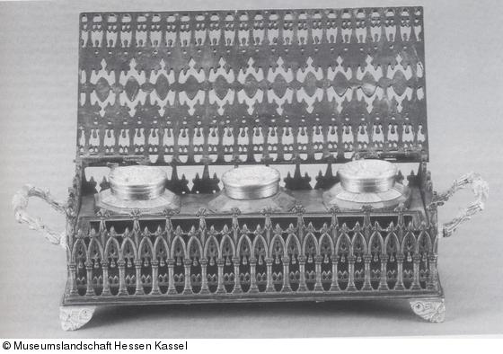 Die Rückbesinnung der um 1800 entstandenen Romantik auf das Mittelalter, in deren Folge auch Renaissance und Barock eine neue Wertschätzung erfuhren, führte im Kunstgewerbe bis etwa zum Ende des Jahrhunderts zur Popularität historisierender Formen. – Die Seiten und der Deckel der rechteckigen aufklappbaren Kassette im französischen Style à la Cathedrale sind von Spitzbogenarkaden mit Maßwerk durchbrochen. Die Gefäße bestehen aus rotem Lithyalinglas (griech. "lithos": Stein), das sich 1828 der böhmische Glasmacher Friedrich Egermann patentieren ließ.