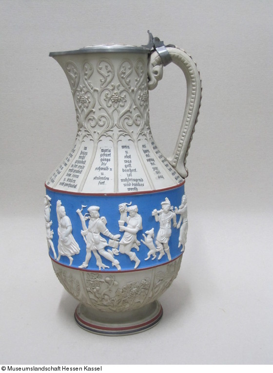 Die Rückbesinnung der um 1800 entstandenen Romantik auf das Mittelalter, in deren Folge auch Renaissance und Barock eine neue Wertschätzung erfuhren, führte im Kunstgewerbe bis etwa zum Ende des Jahrhunderts zur Popularität historisierender Formen. – Über den personifizierten zwölf Monaten, die den Krug auf blauem Grund umlaufen, sind jeweils Textfelder mit auf den Monat bezogenen Bauernregeln (z. B. November „viel hasen viel spring viel jagen viel sing“) angeordnet. Der untere Gefäßbauch und der Hals sind mit reliefierten Ranken und Tiermotiven geschmückt. Noch 1905 wurde der Krug angeboten, wahlweise mit Zinndeckel, passenden Bechern und Holzplateau.