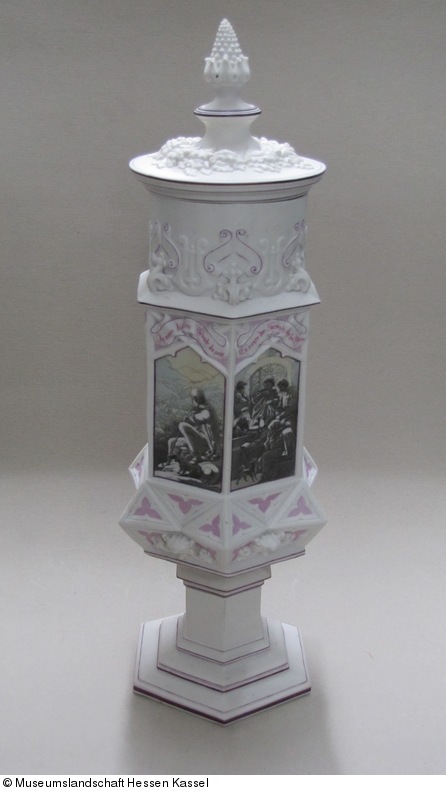 Die Rückbesinnung der um 1800 entstandenen Romantik auf das Mittelalter, in deren Folge auch Renaissance und Barock eine neue Wertschätzung erfuhren, führte im Kunstgewerbe bis etwa zum Ende des Jahrhunderts zur Popularität historisierender Formen. – Auf sechs durch stilisiertes Astwerk eingefaßten Feldern sind in der seinerzeit modernen Drucktechnik der Chromolithographie Szenen deutscher Volkslieder dargestellt. Die zugeordneten Spruchbänder geben die Liedtitel. Der den Gefäßkörper tragende Wulst und der Hals sind mit gotisieren-den Architekturmotiven geschmückt.