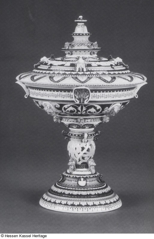 PJ (Die ligierten Buchstaben PJ (Prosper Jouneau) sind als Bestandteil des Renaissance-Rankenfrieses auf der Wandung der Schale eingearbeitet.); auf dem Boden: AP 12. (Braune Unterglasmarke: AP, ligiert (= Paul Amirault, Geschäftspartner von Prosper Jouneau), Ritzzeichen 12.); weißes ovales Papierschild: Faiences Artistique, Mod le DA, Prix..., Amirault, à Parthenay. (mit roter Schrift); Amirault 20/6/95 (Papierschild im Deckel, beschriftet mit schwarzer Tinte; die Hälfte eines Preisschildes zeigt: (engl. Pfund) D.A.);