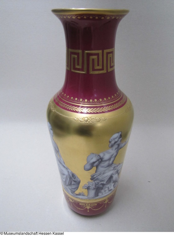 Porzellan, farbig glasiert, goldstaffiert, Grisaillemalerei. |