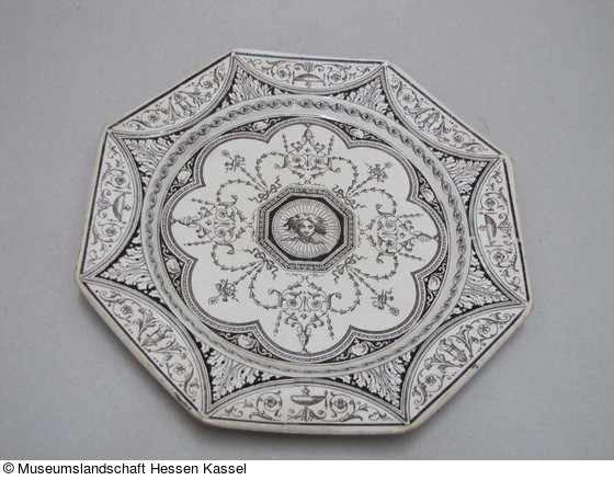 Fayence (earthenware) mit gedrucktem Dekor in Dunkelbraun auf crèmefarbenem Fond. |