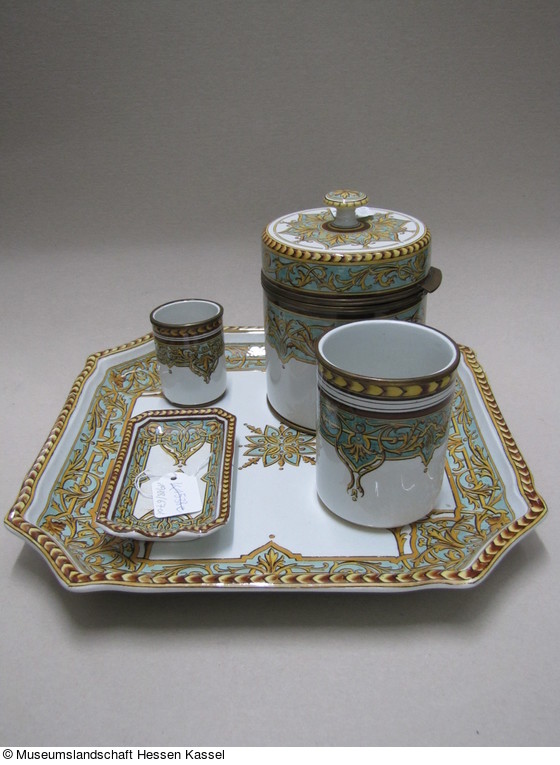 Fünfteiliges Rauchservice mit Blattrankendekor: KP 1988/67a Tabacksgefäß, KP 1988/67b Becher, KP 1988/67c Kleiner Becher, KP 1988/67d Aschenbecher, KP 1988/67e Tablett.