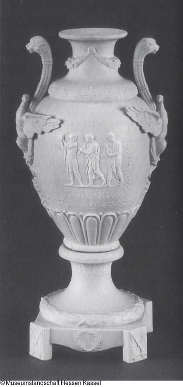 Biskuitporzellan, aus zwei Teilen gefertigt: Fuß und Sockel, Korpus und Hals mit Griffen. |