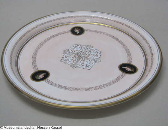 Milchglas, formgeblasen. Boden der Becher glattgeschliffen. Bemalung: fleischfarbener Grund, von dem nur der Fußrand, die Lippe und das Innere des "Kameen"-Rahmens ausgespart blieb. Köpfe der "Kameen" bunt, schwarzer Grund. Mäander in Rot, "Kameen"-Rahmen und Randstreifen in Gold |
