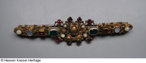 Kupferlegierung gegossen, vergoldet. 6 halbe Perlen, Perlmutt, 2 grüne, 6 rote und 4 violette Glassteine in Facettenschliff. |