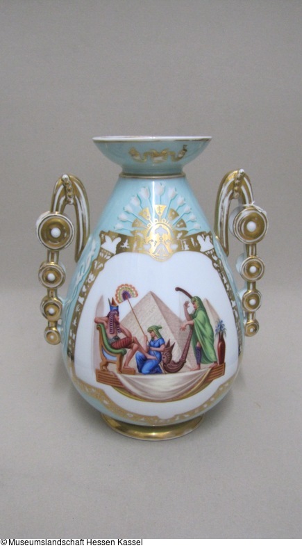Porzellan, formgefertigt, weiß glasiert. Bemalung in Aufglasur: Türkisfarbener Fond, bunte Szene in der Reserve der Schauseite; Vergoldung der Henkel-Vorderseite, des Standfusses, der Rahmung der Reserve (mit Aussparungen) |